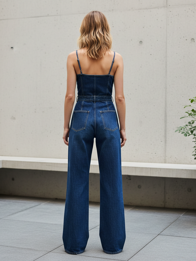 Dark blue corset‑style denim jumpsuit for modern style lovers seeking a day‑to‑night, one‑piece silhouette.