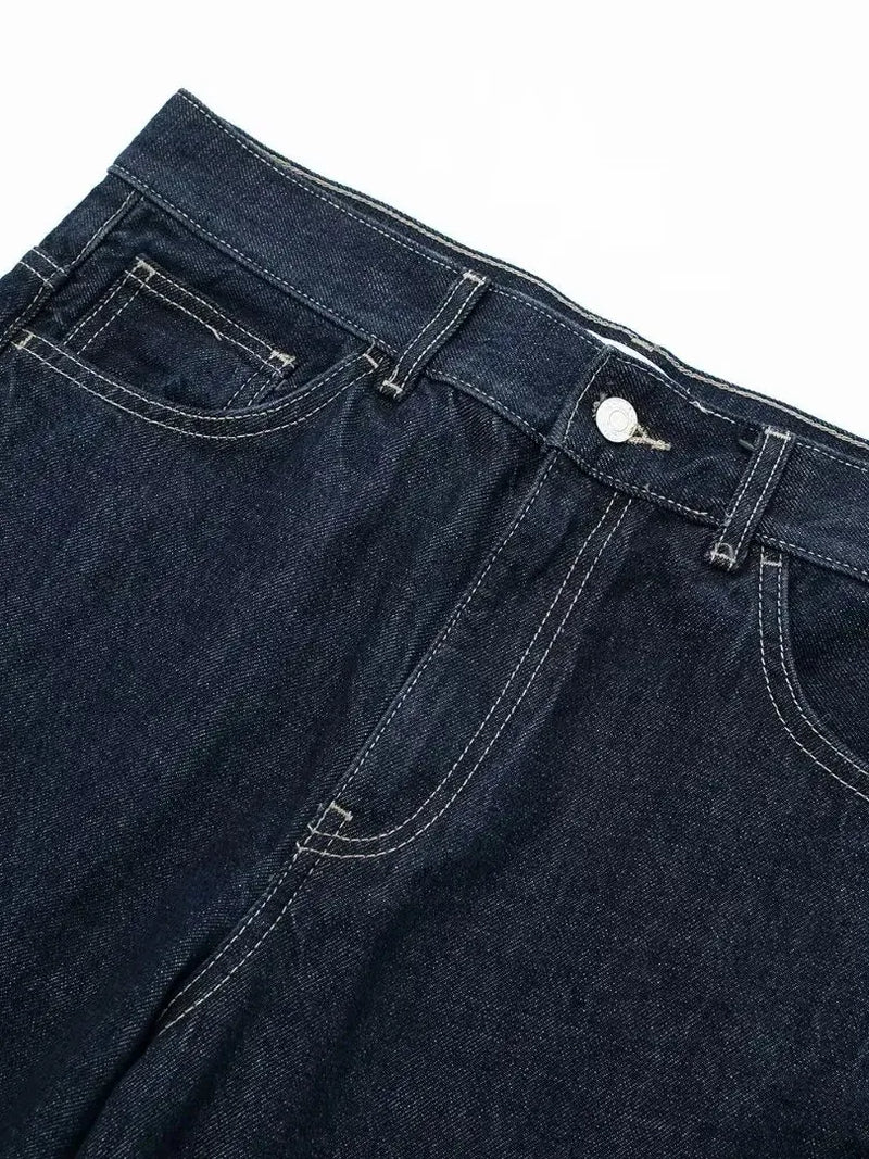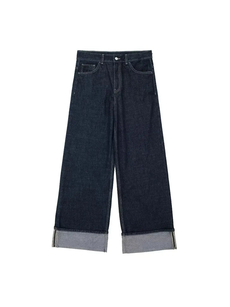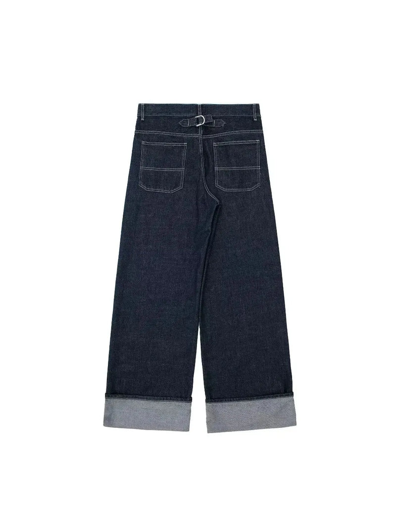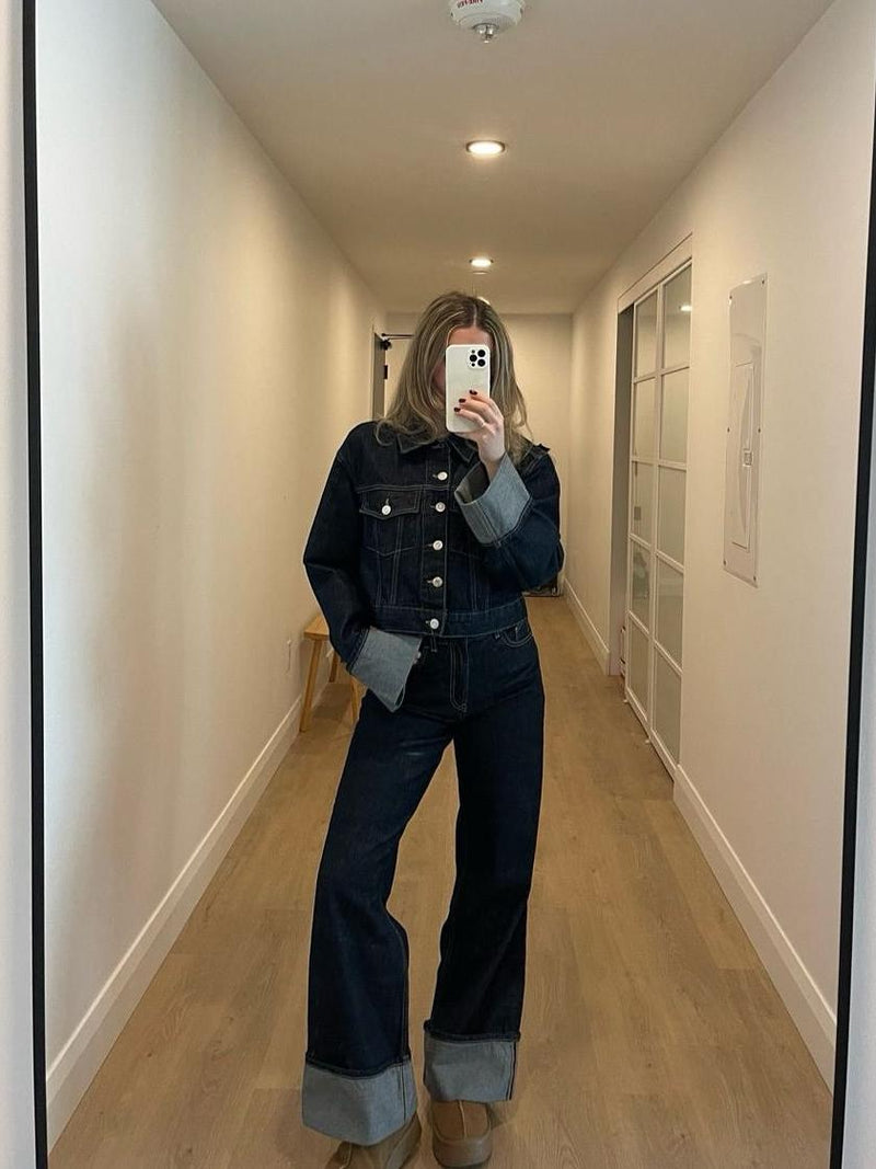 This stylish denim set for women consists of a cropped denim jacket with striking contrast stitching and wide-legged high-waisted jeans. The turned-up hems and dark wash give the outfit a modern, casual look. Perfect for street style looks, it's versatile—whether you wear it with sneakers for everyday wear or with heels for a chic upgrade.