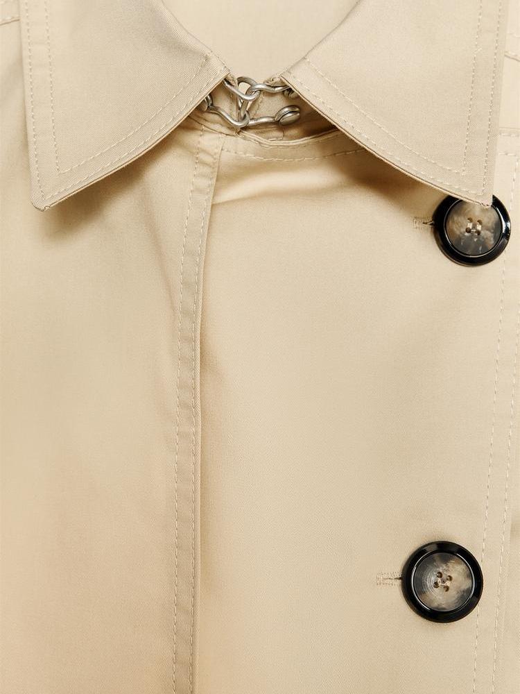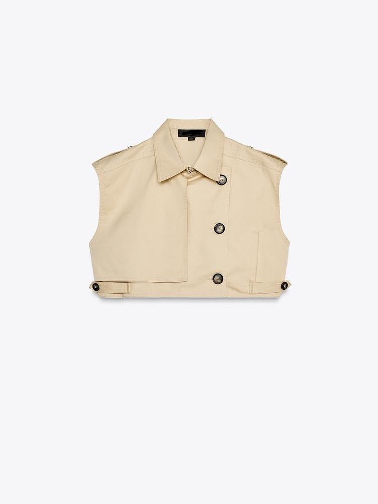 Cropped gabardine top. Lapel collar and sleeveless. Front welt pocket. Belted hem. Front button and metal hook closure.