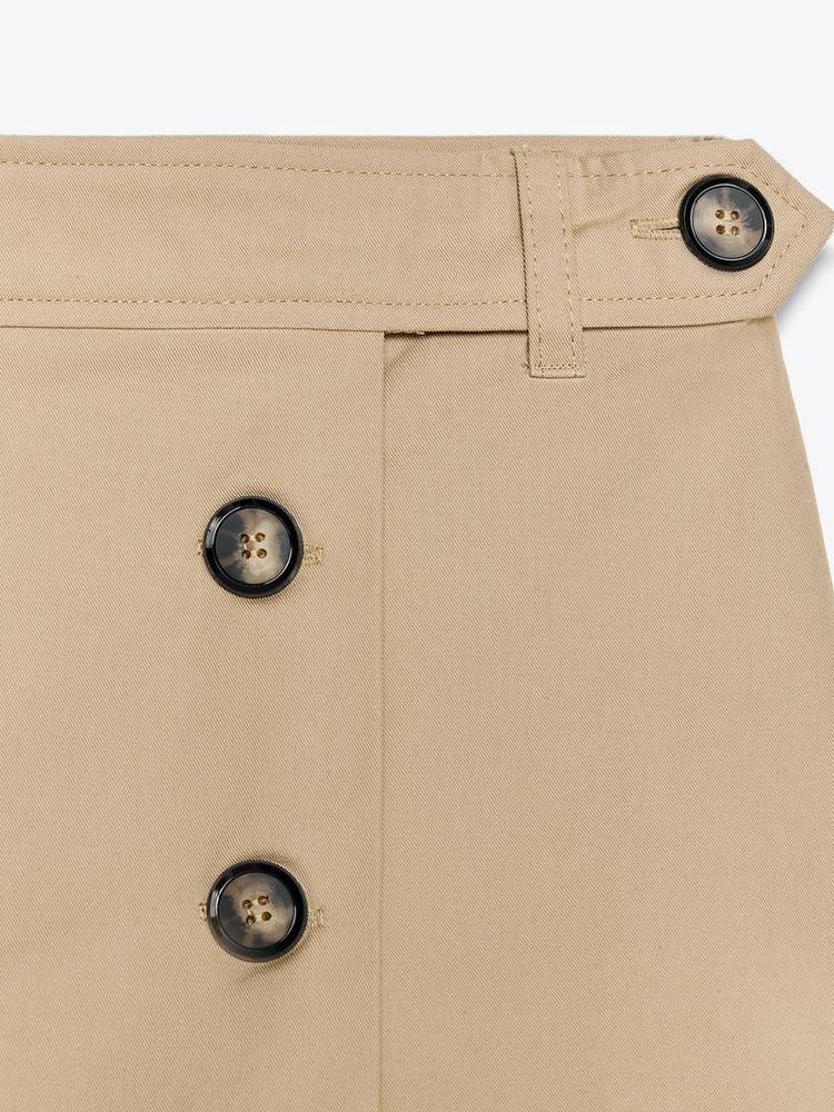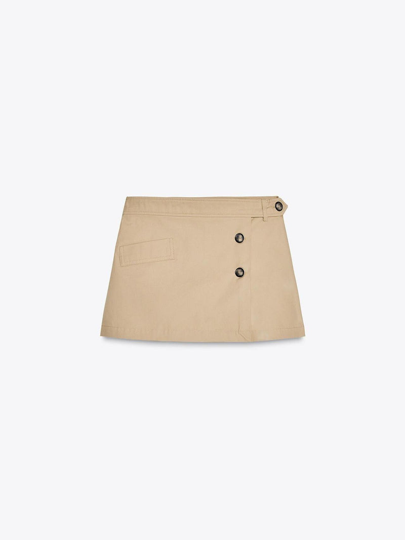 Mid-rise skort. Mock pockets on front and back. Belt loop and button detail. Hidden zipper closure at side seam.