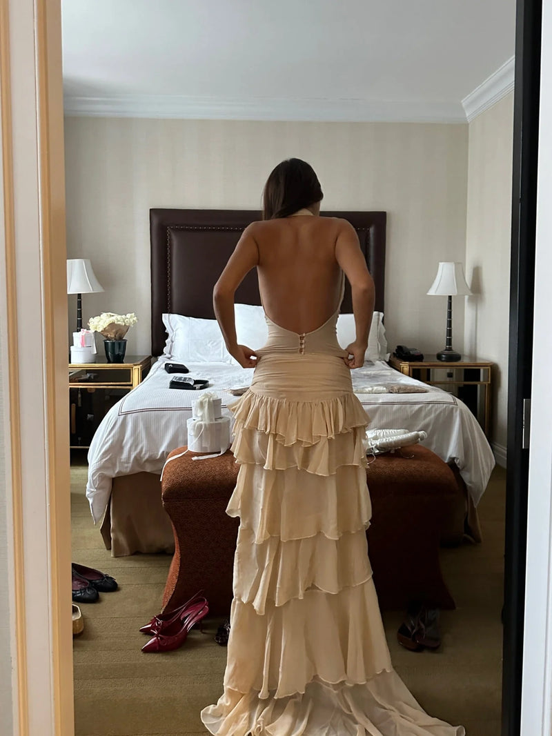 Halterneck Ruched Cowl Neck Ruffle Mesh Asymmetric Skirt Coord Set Set