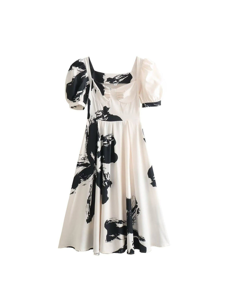 A corset-inspired, waist-defining midi dress in a black-and-white tie-dye brush pattern for modern wear.