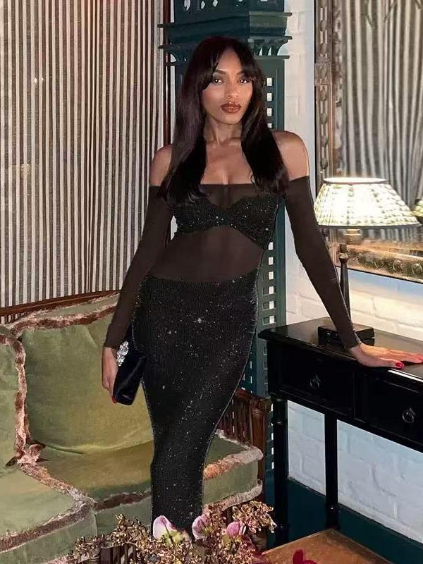 Dazzle in this sophisticated off-shoulder gown, designed for nights where you own the room. This masterpiece features a fitted silhouette in sparkling stretch fabric, bold mesh insert panels at the bodice and waist, and an elegantly draped off-the-shoulder neckline for a sultry yet refined look. The body-skimming cut and subtle shimmering details make it the ultimate pick for upscale events, cocktail parties, or modern soirees. Available in regal wine and classic black.