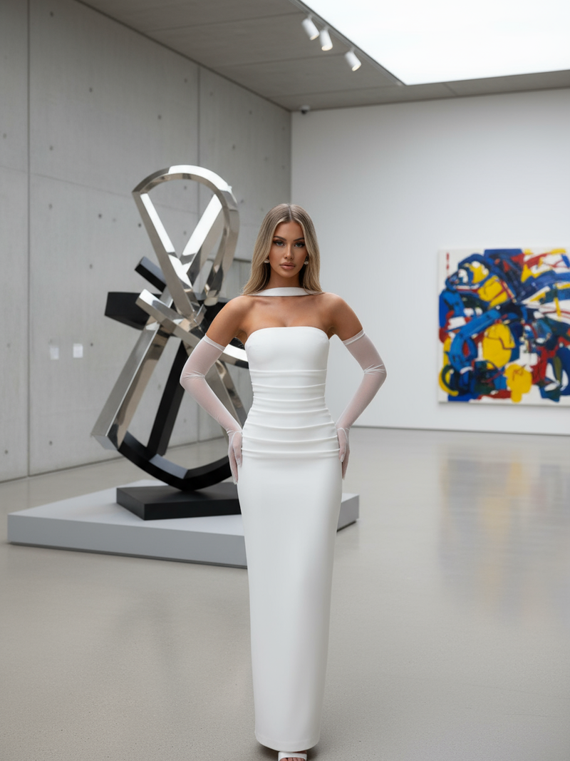 Strapless Sleeves Ruched Tube Maxi Dress with Scarf