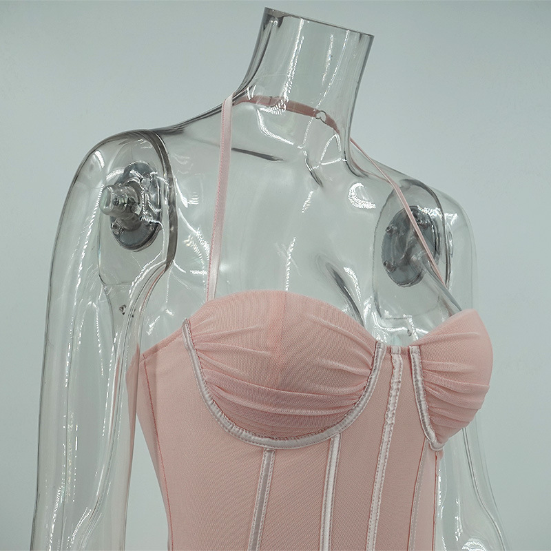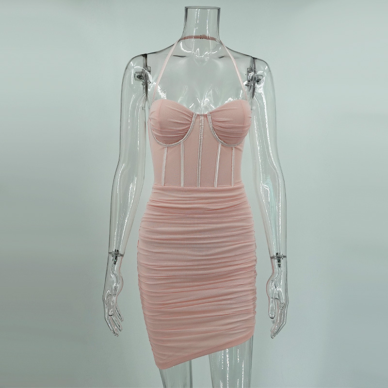 Boning Corset Pleated Mesh Irregular Asymmetric Halter Dress