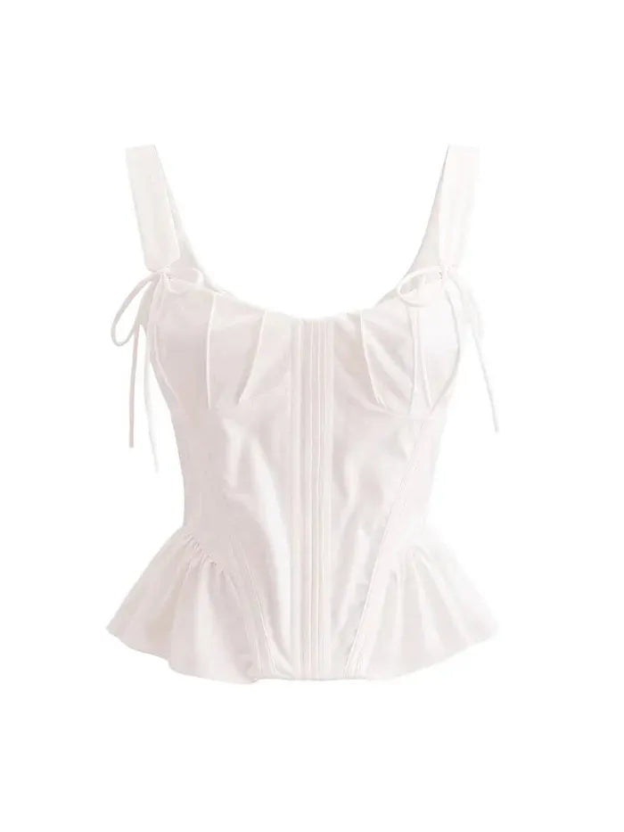 Summer days are made for this elegant designer cropped top—ready to bask in the sun! This sleeveless corset top features a bustier with pintucked detailing, mimicking a delicate shell shape. Adjustable wide shoulder straps knot at the front with charming bow trims. Pleated accents enhance the flouncy edge, creating a romantic silhouette. The V back and zipper ensure a perfect fit, making it both stylish and practical. Easy to pair and suitable for any occasion, this cute peplum top is a versatile piece for sweetness and fun.