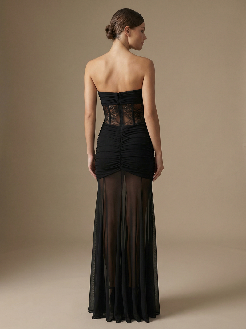 Thisstrapless maxi dress features a sweetheart-style bodice with a sheer lace midsection that subtly highlights your curves. The ruched detailing at the waist and hips creates a flattering hourglass shape, while the lightweight, semi-sheer skirt flows beautifully for a soft, romantic look that is perfect for parties, cocktails, and summer events.