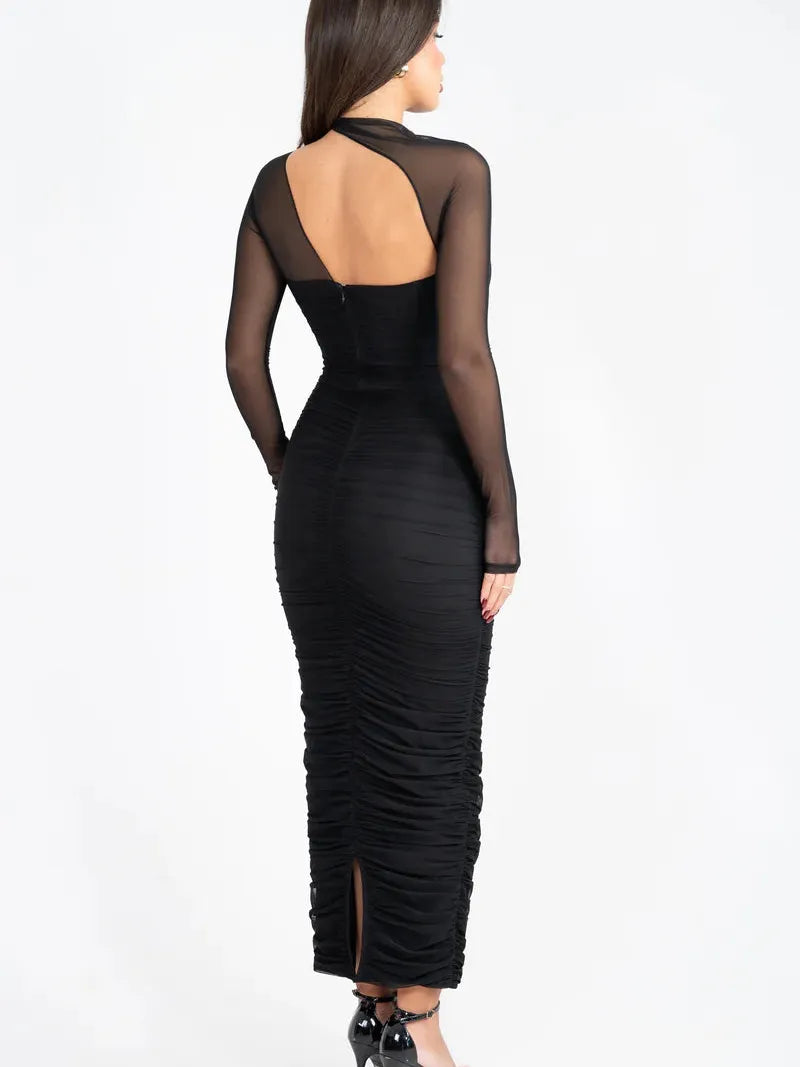 Mesh Full Sleeves Ruched Sheath Hollow Out Cutout Maxi Dress