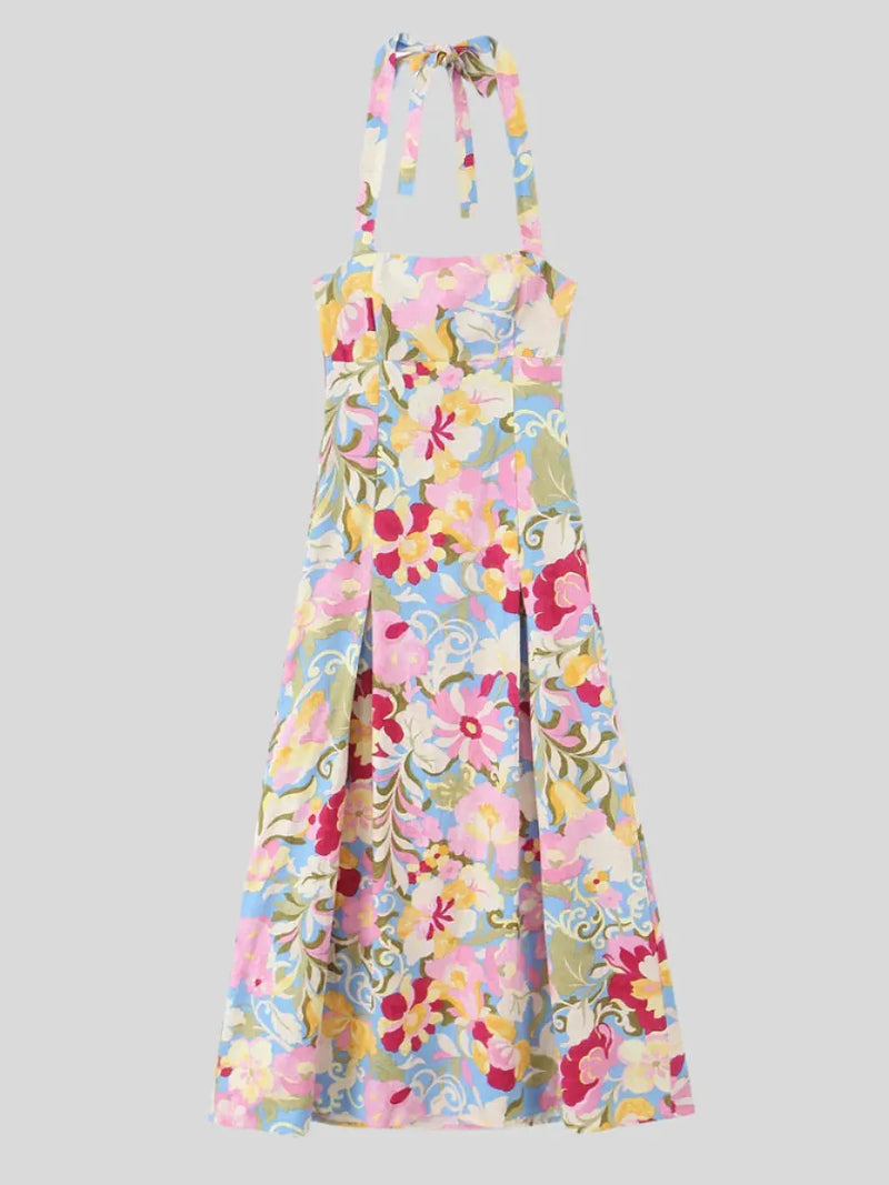 Rysa Floral Patterned Halterneck Maxi Backless Tied Dress