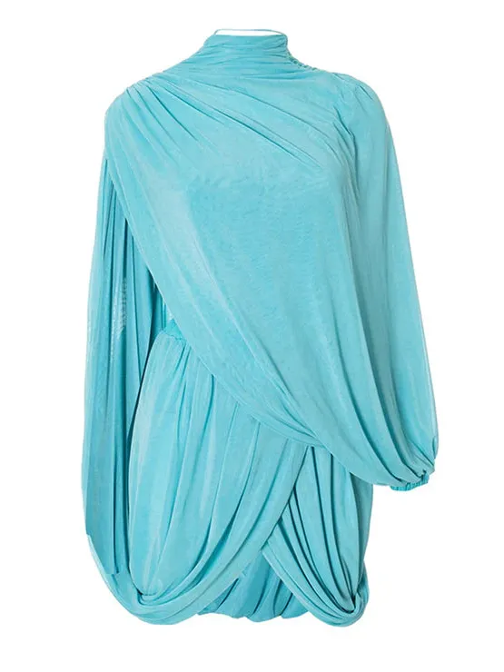 Aqua Draped Cape Mini Dress is a luxe, evening-ready silhouette for cocktail nights and special events.