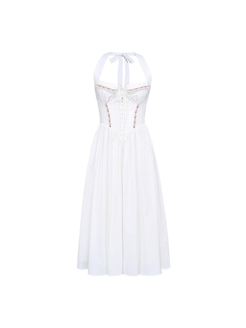 A dreamy white Embroidered Corset Halter Midi Dress with a lace-up bodice, floral embroidery, and a floaty full skirt—perfect for brunch, vacations, and summer dates.