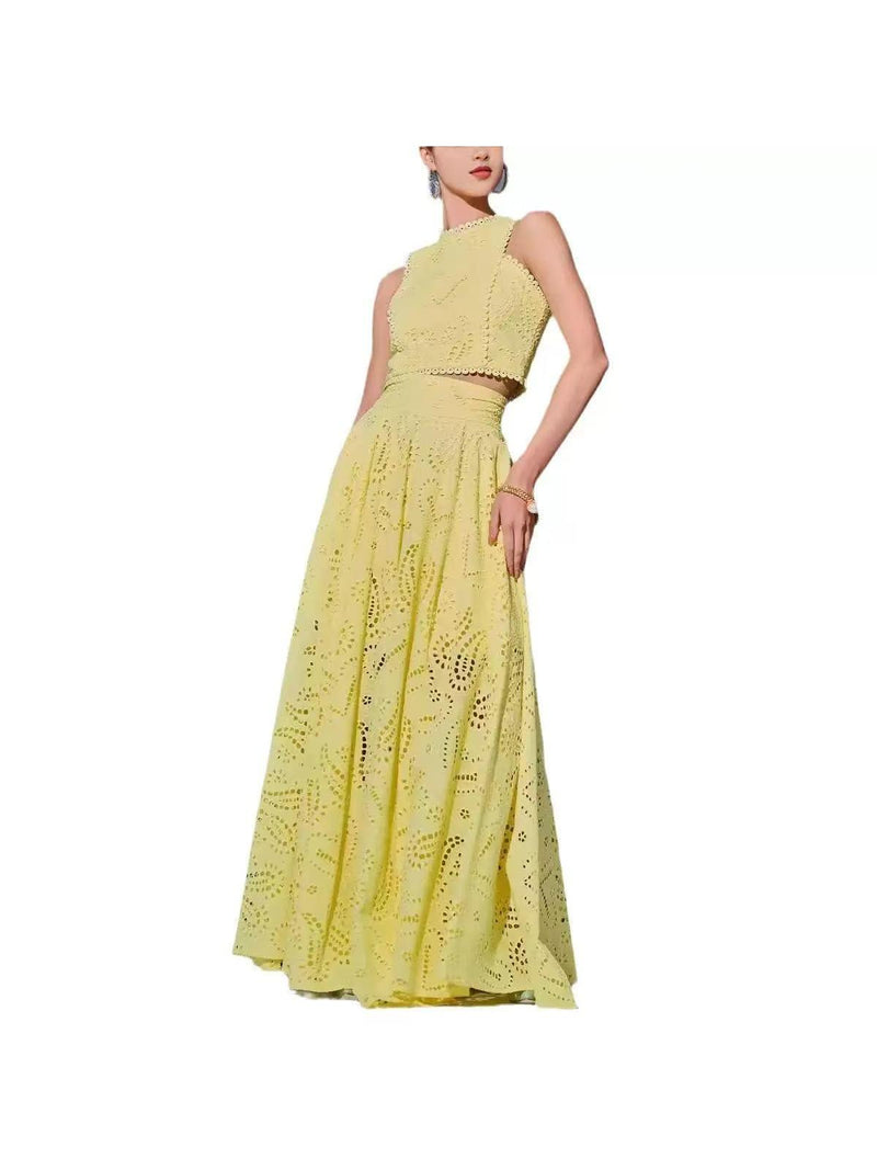 Chic and elegant, this cut-work two-piece set features a round neckline, backless waist-revealing design, and intricate embroidery. Paired with a high-waisted flared midi skirt, it's perfect for vacations, parties, or stylish day-to-night looks.