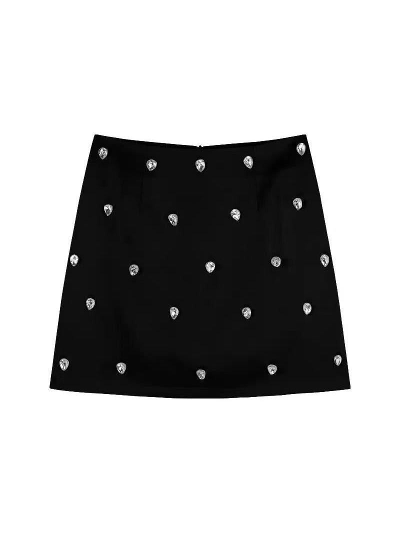 Crystal-studded A-line mini skirt for party-ready looks, versatile for nightlife and festive events.
