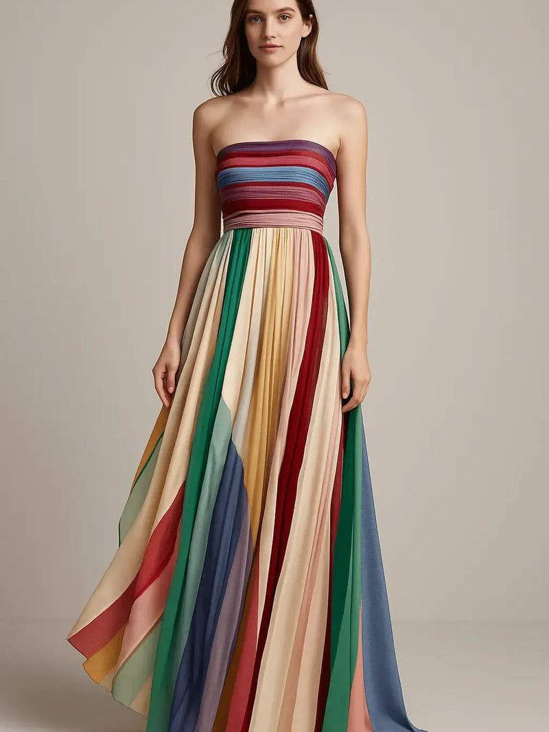 A bright, strapless rainbow maxi dress designed for sun-soaked celebrations and summer nights.