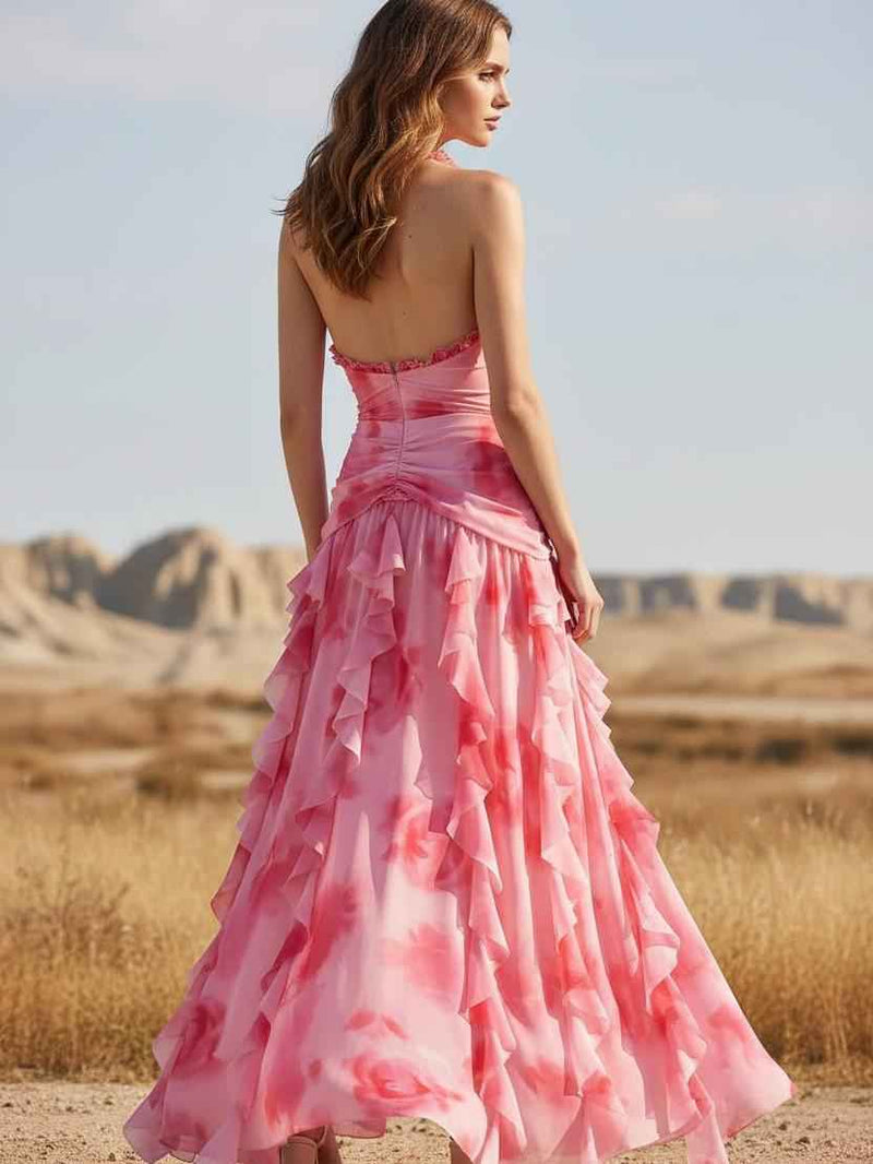 A romantic resort set featuring a ruched V-neck swimsuit with delicate ruffle trim along the straps and neckline, paired with a matching high-waisted maxi skirt finished with cascading asymmetrical ruffles. The fluid tie-dye fabric and flouncy layers create dreamy movement, making this look perfect for beach parties, sunset dinners or island getaways.