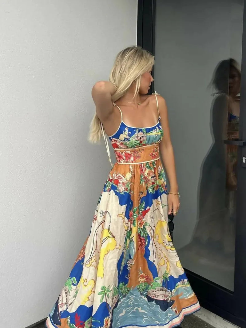 The perfect addition for any spring/ summer occasion, dress features a nautical map print with fine detail, pay close attention and you'll notice the seashell charms on the shoulder ties! Beautiful!