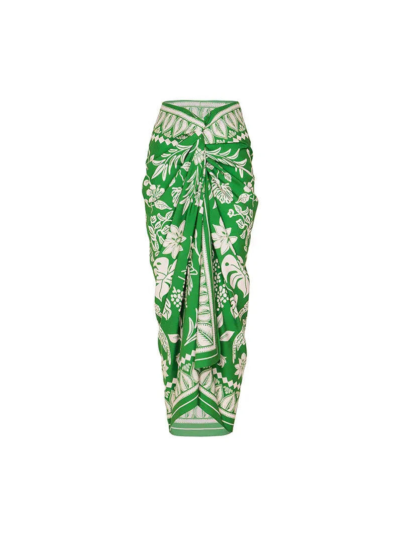 This trendy green floral print bikini set features a ruffled bikini top paired with high-waisted bottoms for that perfect summer outfit vibe. The matching wrap-around sarong skirt adds extra elegance, making it ideal beachwear for a tropical vacation. Designed for both style and comfort, this vacation bikini set is the perfect swimwear with sarong combination.