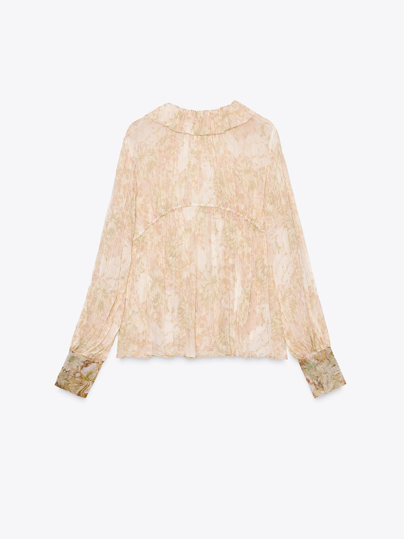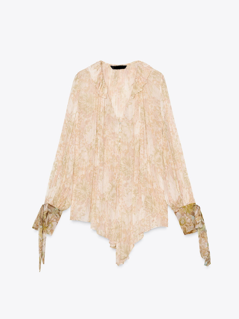 Round neck shirt with ruffle and adjustable drawstring V-neckline. Long sleeves with contrasting tie cuffs. Asymmetric hem. Front button closure.
