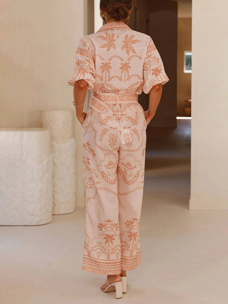 Stay stylish and comfortable in our casual and elegant printed linen short sleeve top and belted straight pants set.