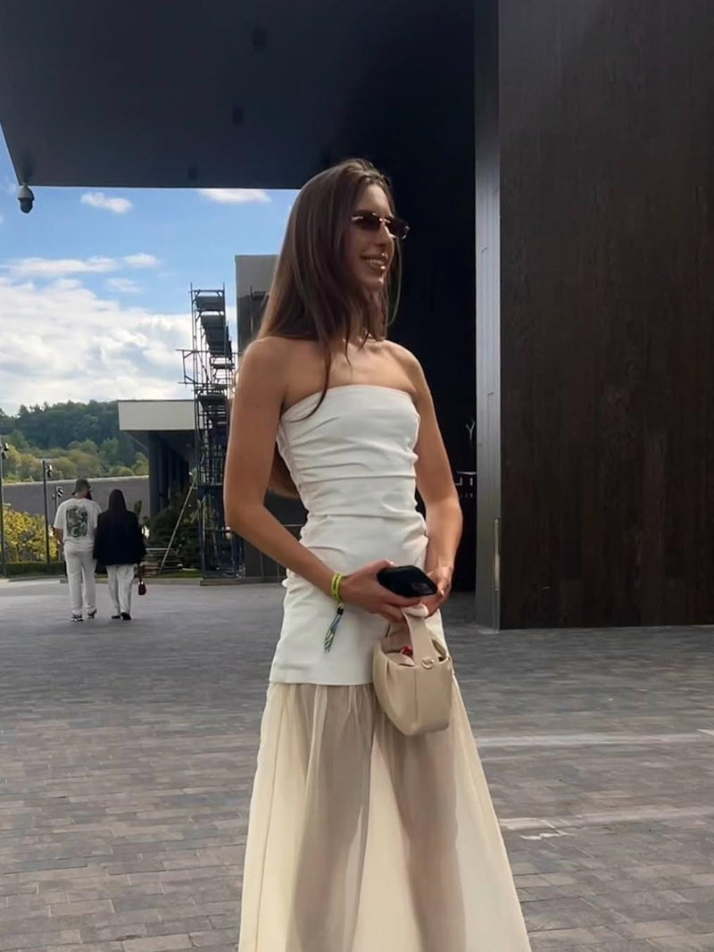 Midi dress with a straight neckline and off-the-shoulder detail. Hem detail with contrasting fabric. Side ruching for a draped effect and concealed metal zip fastening.