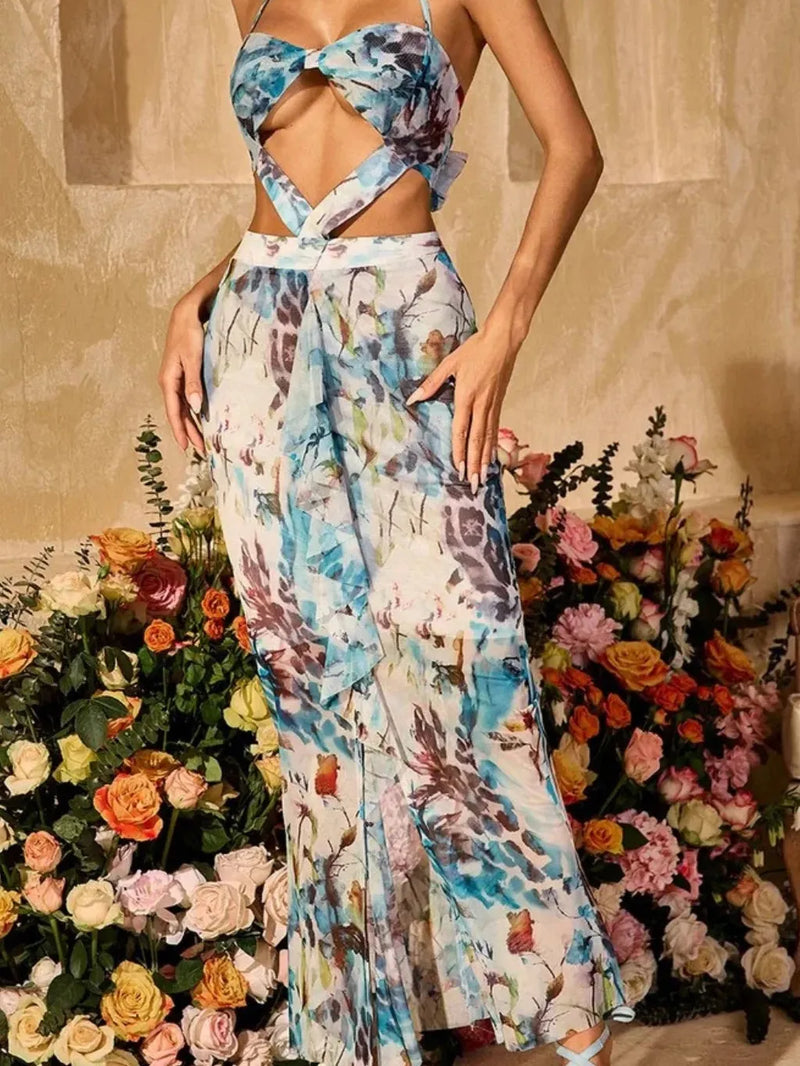 Floral Print Cutout Beach Backless Halterneck Frill Dress