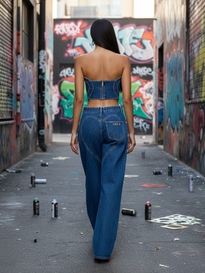 Features contrast heart-shaped stitching in front, frayed hemline, and bold seams that enhance the silhouette