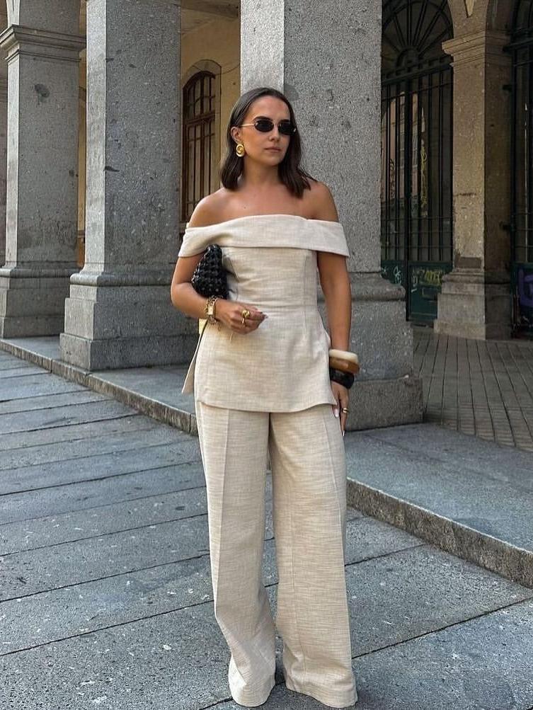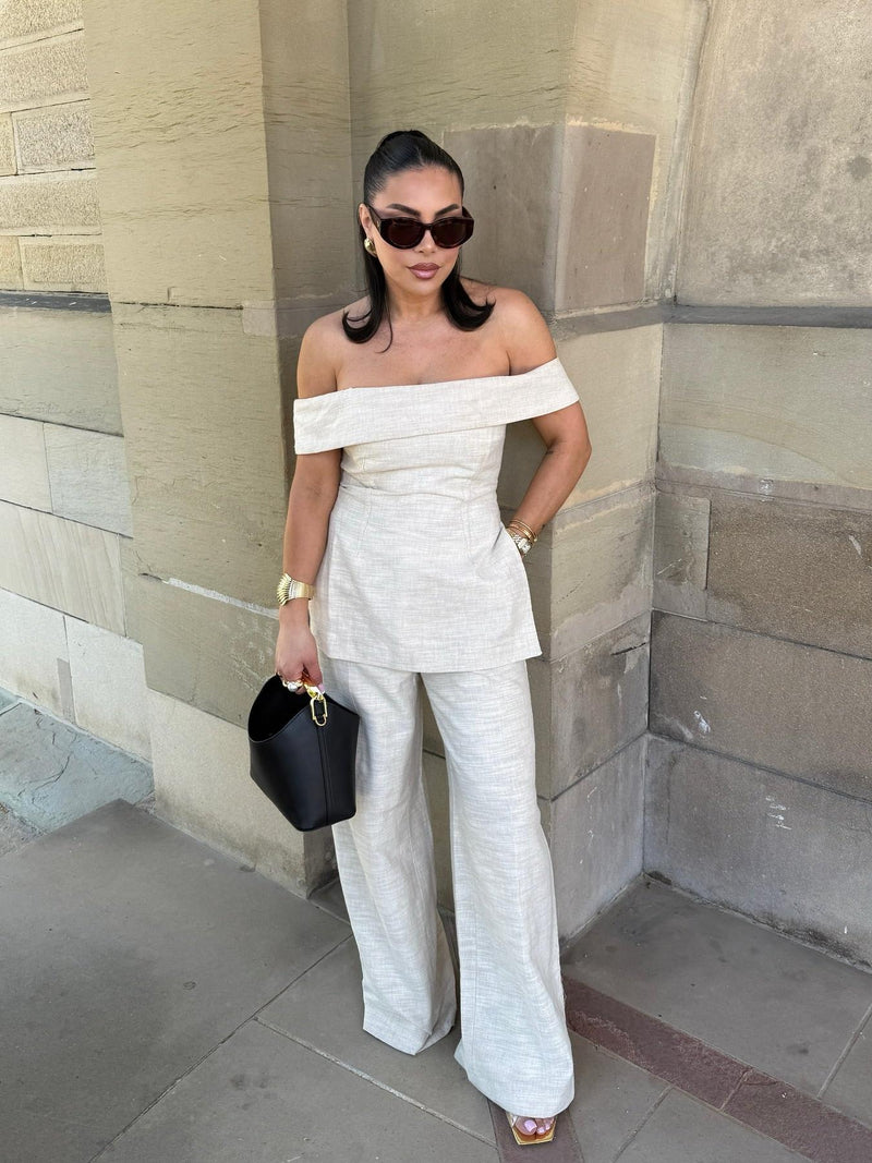 June Allure Off Shoulder Strapless Top & High Waist Pants Coord Set
