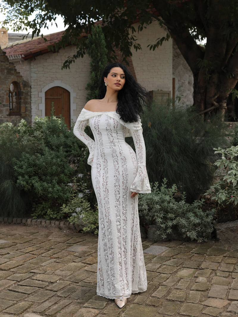 Off-shoulder mermaid silhouette, adorned with delicate lace trims that exude youthful charm. The ruched detailing on the shoulders enhances the feminine softness of the design, while the intricately textured lace fabric adds an air of sophistication. Crafted with care, the beige lace overlays a warm apricot lining, creating a visually rich, layered effect. Bardot neckline, its flared Full sleeves and its captivating cut, it is ideal for a wedding, a garden party or a goddess look on Instagram 📸✨