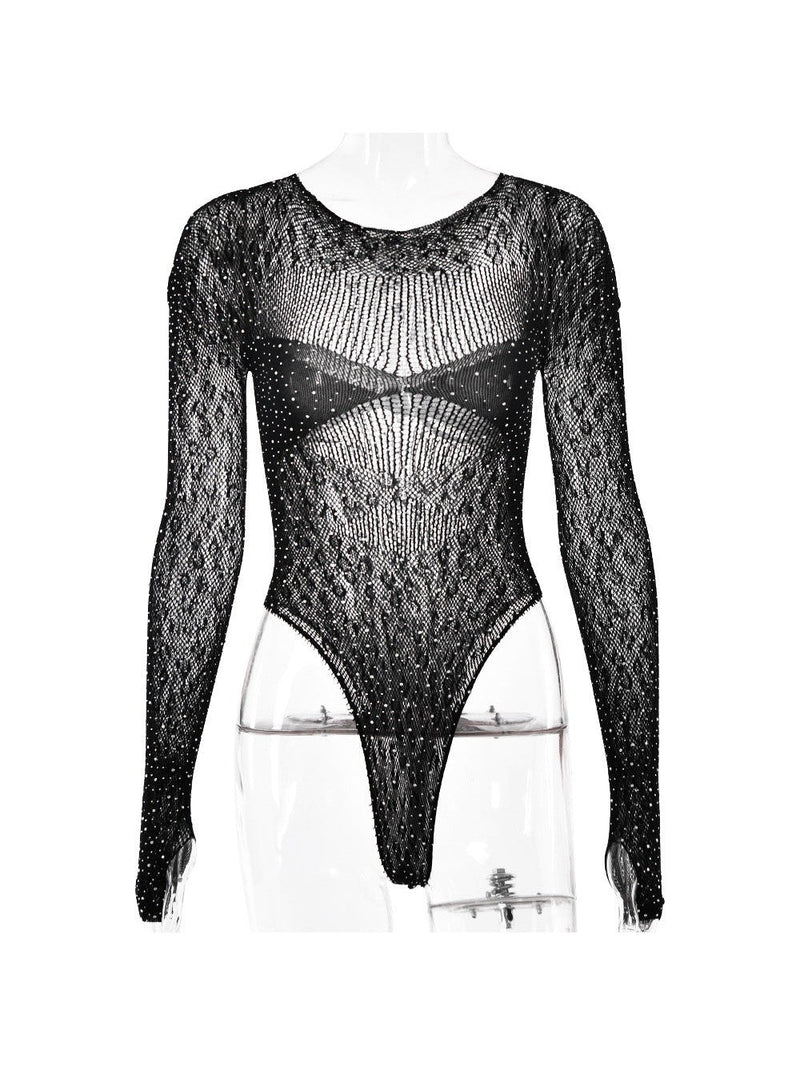 A sheer, rhinestone-embellished bodysuit top designed for nights out, layering, and standout glamour.