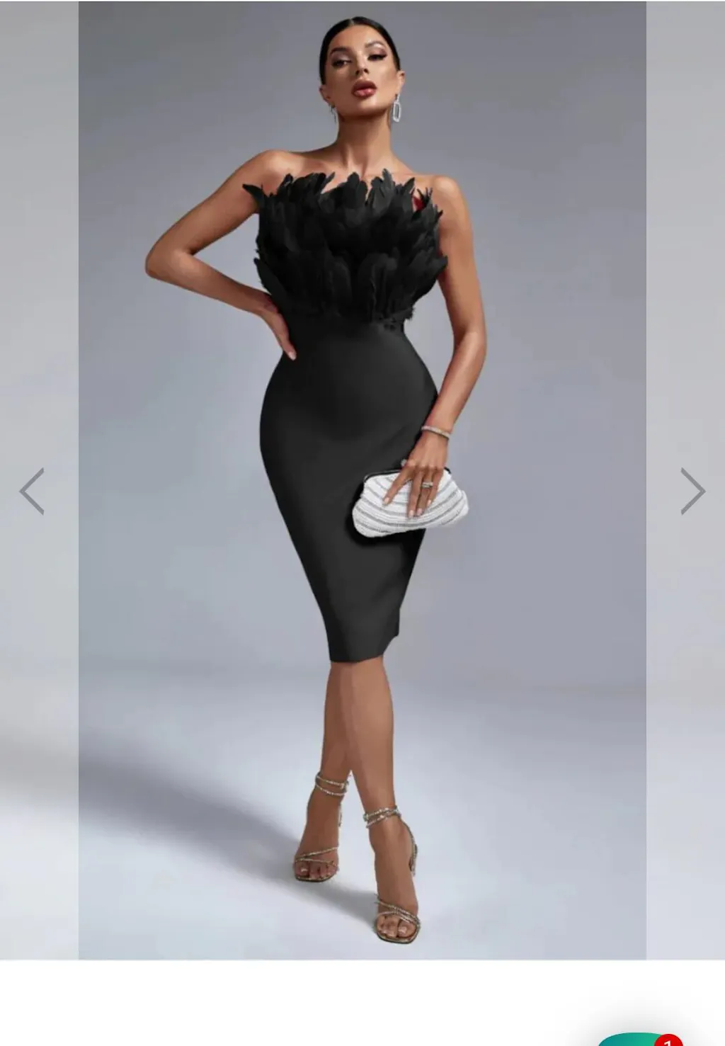 A sleek feather-trimmed tube-bodycon dress for evenings out, delivering a sculpted silhouette with comfortable, move-with-you stretch.