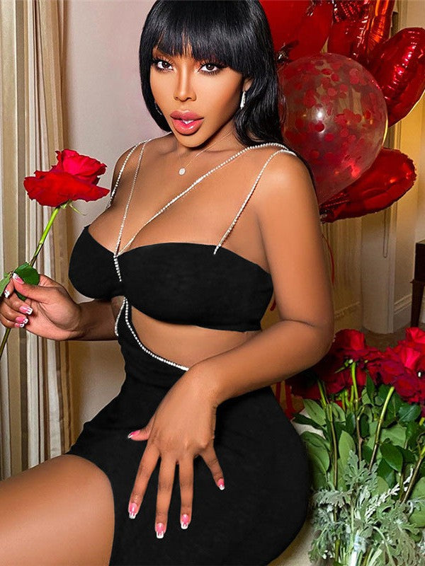 Rhinestone Suspenders Backless Hollow Out Slit Dress