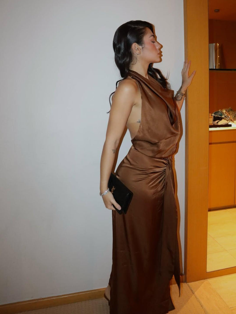 Flowing halter neck dress with a bare back. Featuring a front knot detail, a hem with a front slit and a concealed back zip fastening in the seam.