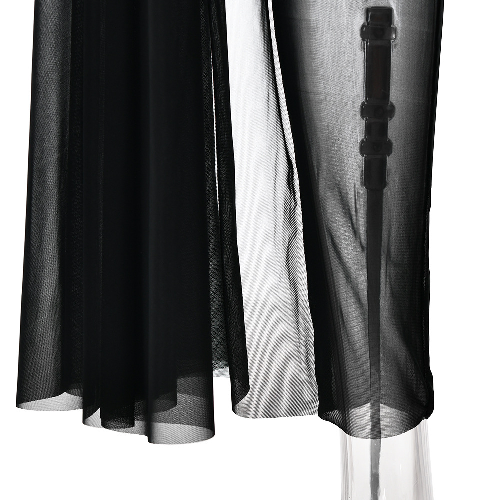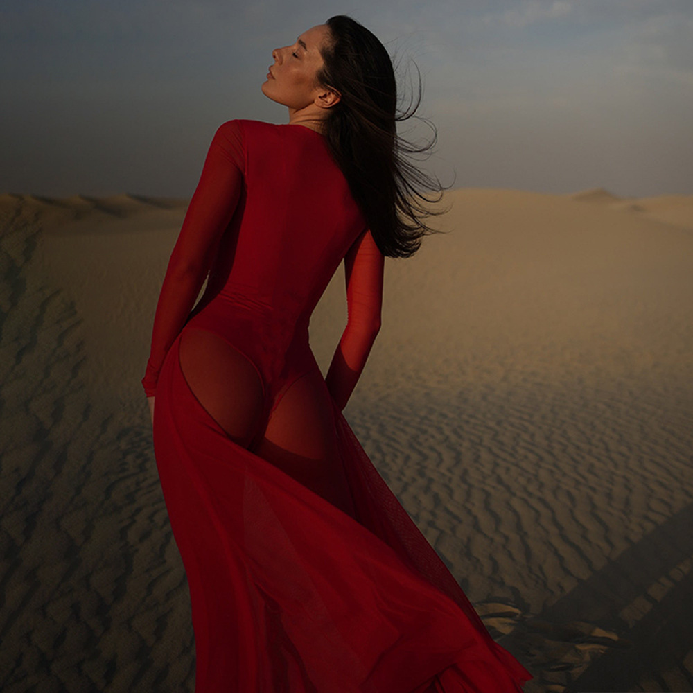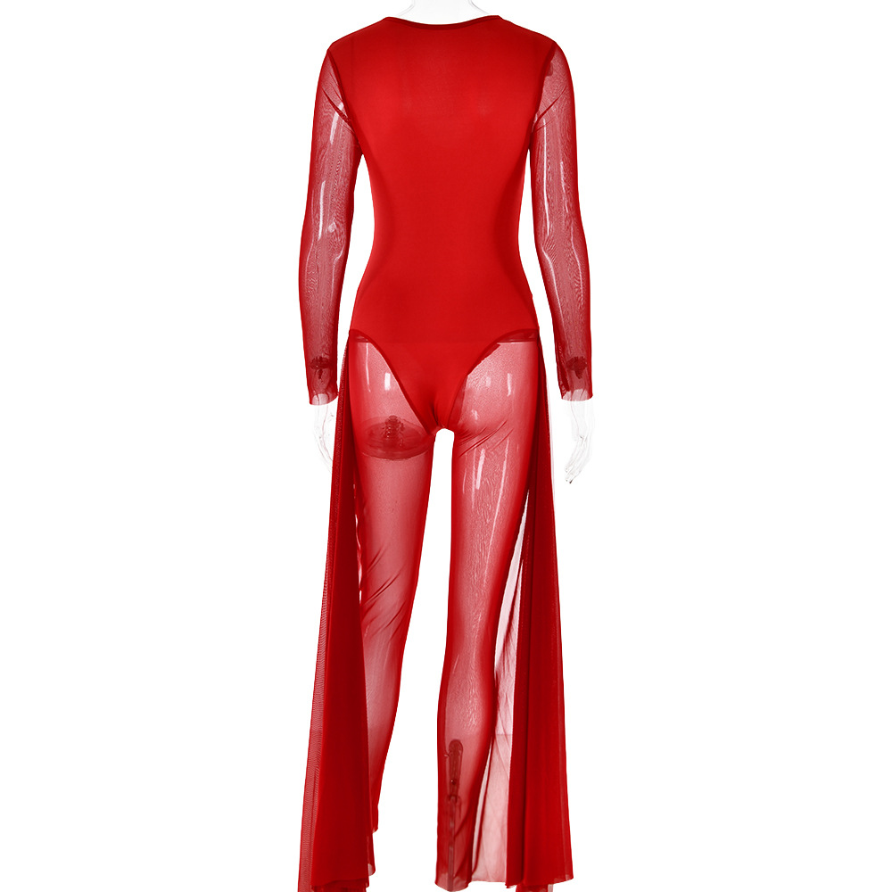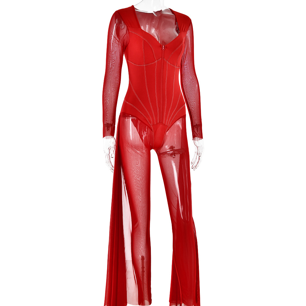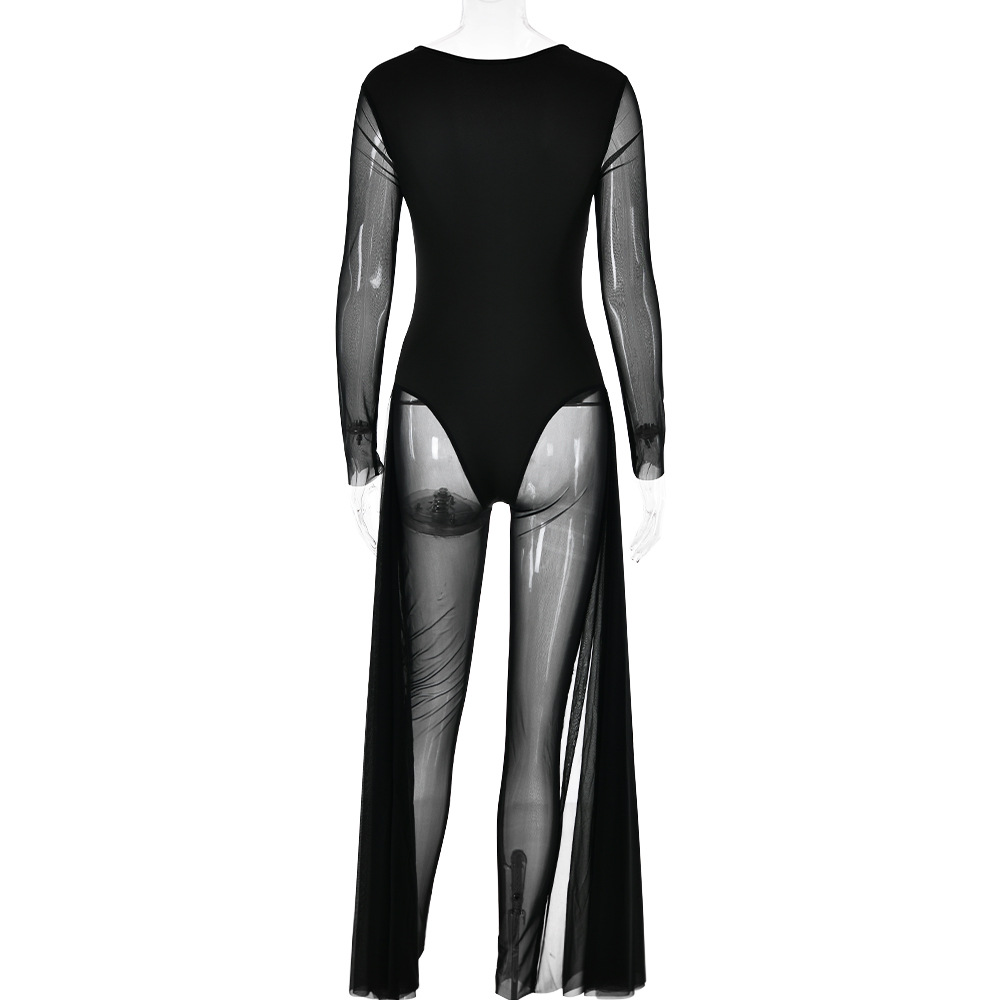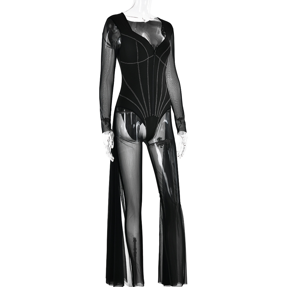 An exquisite corset jumpsuit model for dancing, featuring sheer fabric on the legs and arms, and a transparent mesh decoration in the hip area to create a light, floating silhouette.