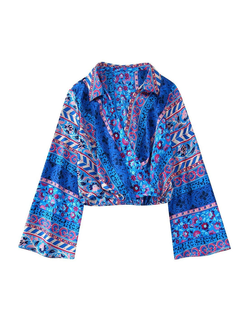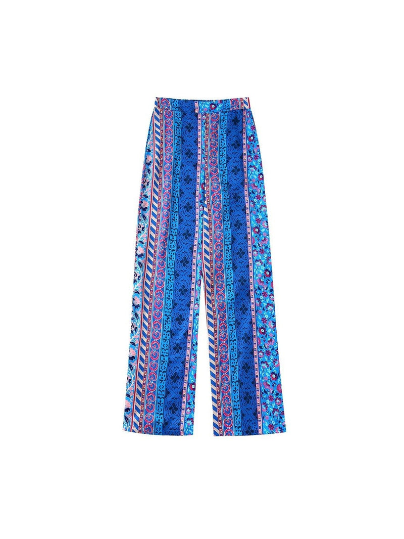 Printed Cozy Cropped Blouse and High Elastic Waist Wide Leg Pants