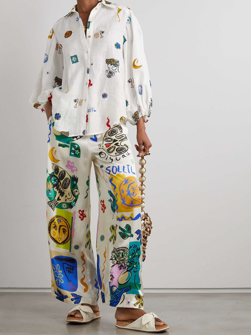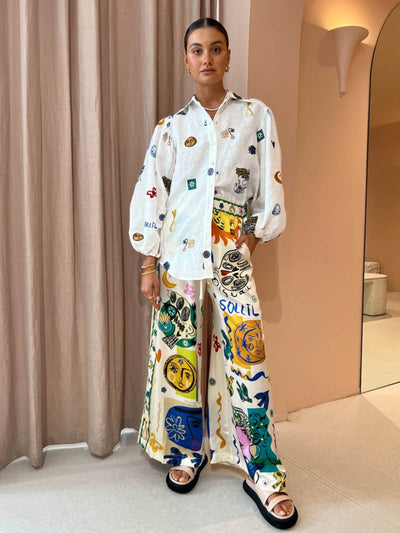 White Abstract Print Satin/ Linen Shirt & Pants Coord Set